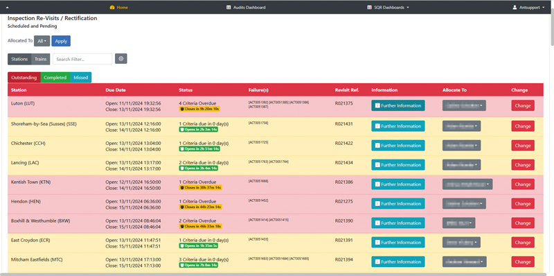 Stay on top of inspection performance with Re-inspection Dashboard – offering a clear breakdown of revisits by station or train, real-time status updates (Outstanding, Completed, or Missed), and full visibility into failed criteria.